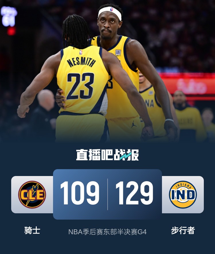 西卡21+6 特纳20+7 米切尔伤退 步行者20分大胜骑士夺赛点